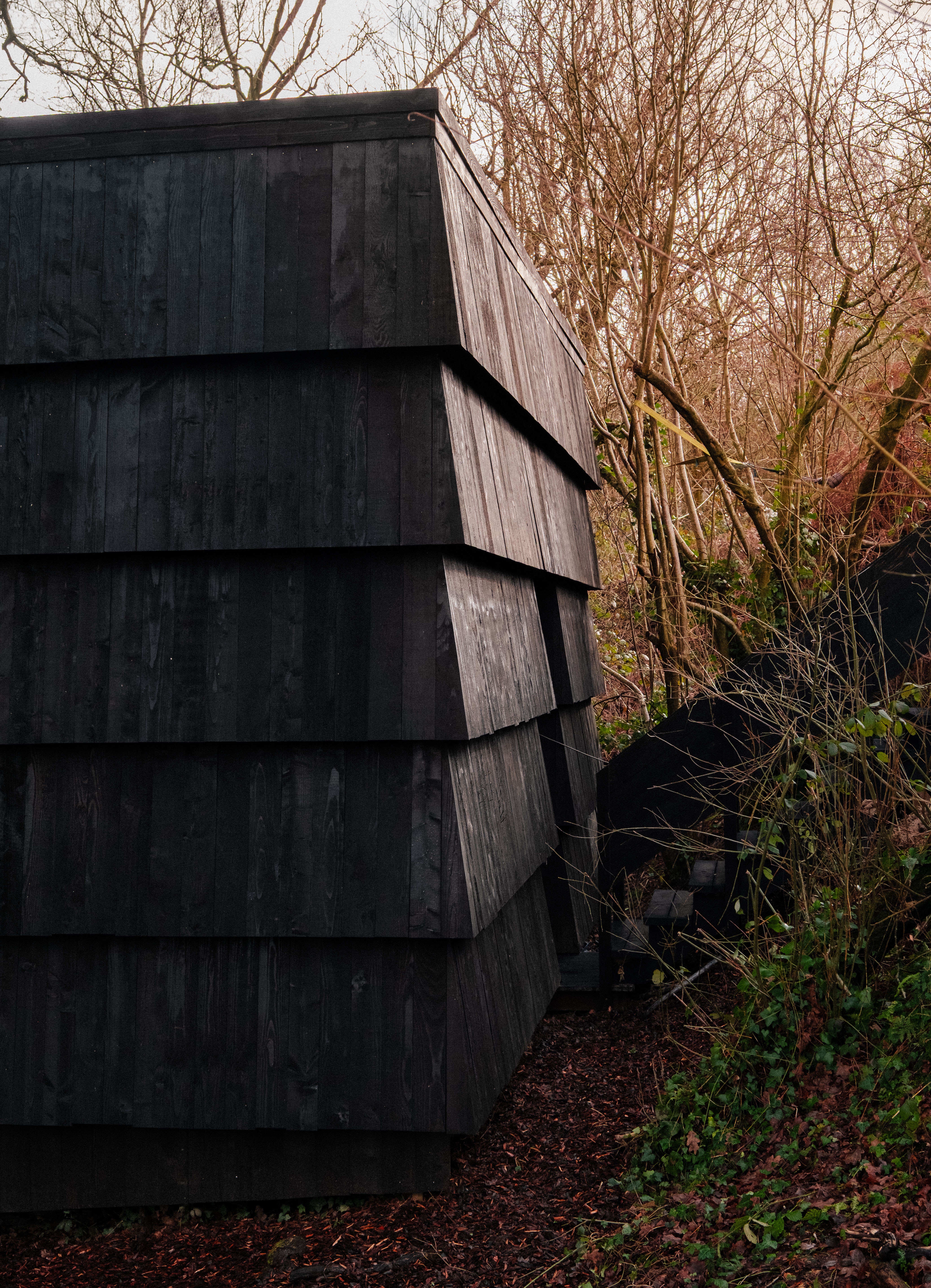The design draws from the vernacular granaries and elevated grain stores once common across Southeast England. These modest agricultural structures, historically raised to protect harvests from moisture and pests, are reinterpreted here as a contemporary timber pavilion lifted lightly above the woodland floor. The cabin’s form is wrapped in vertically louvered larch cladding, sourced from the surrounding estate, providing filtered light, privacy, and natural ventilation while referencing traditional drying sheds.