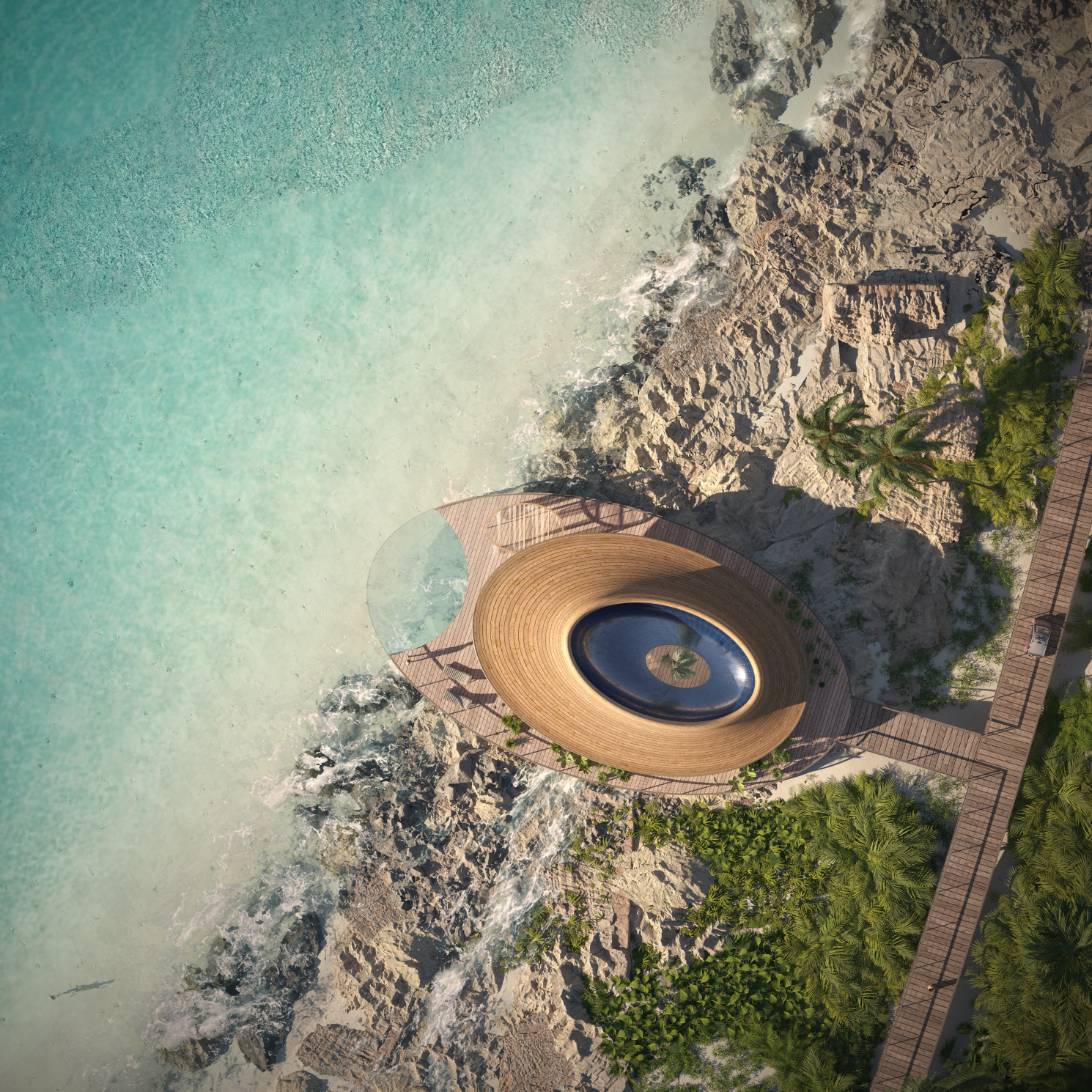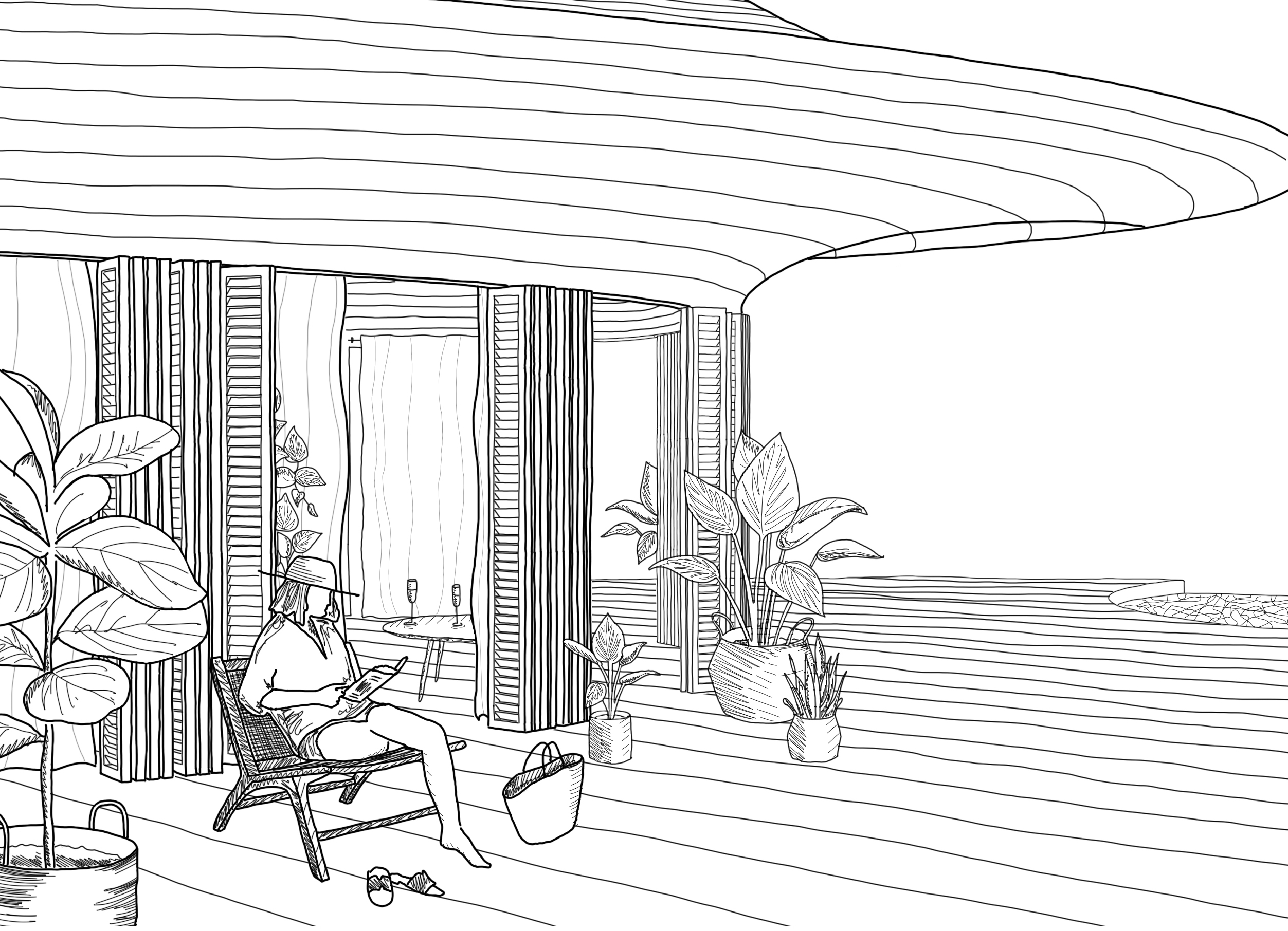 The primary intervention takes the form of a substantial new nature reserve and wildlife habitat, occupying the centre of the island. Protected by a raised boardwalk that forms a loop around the island in order to create a sheltered area wherein the natural conditions of the island can be ‘rewilded’. Existing wildlife can flourish and lost species sensitively reintroduced in brownfield locations, for example the protected Blolly tree. The nature reserve would be inaccessible to guests, whilst maintaining unhindered passage for plants, animals and insects underneath. The reserve would provide a visual and audible backdrop to all the villas enhancing the tranquillity of their setting and proximity to nature. Over time, the resort would become more robust to extreme weather events and nature tours would provide educational and revenue opportunities for guests and locals alike.